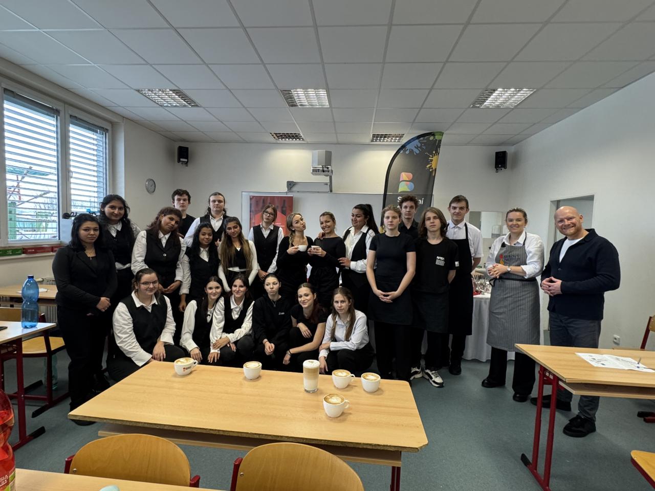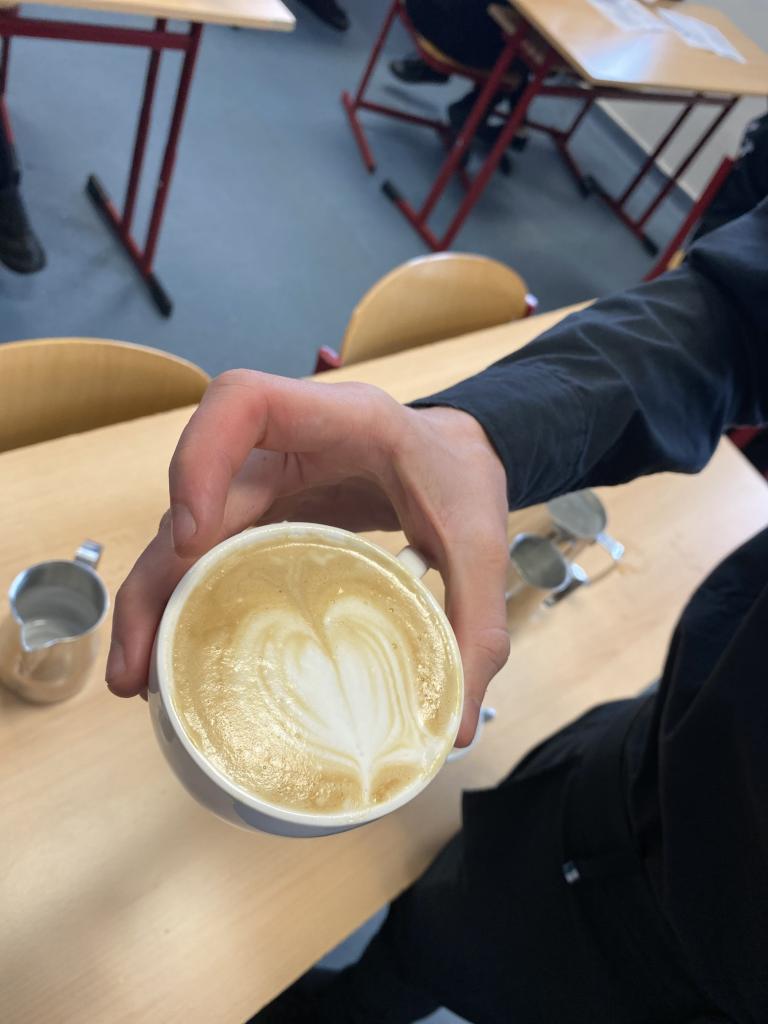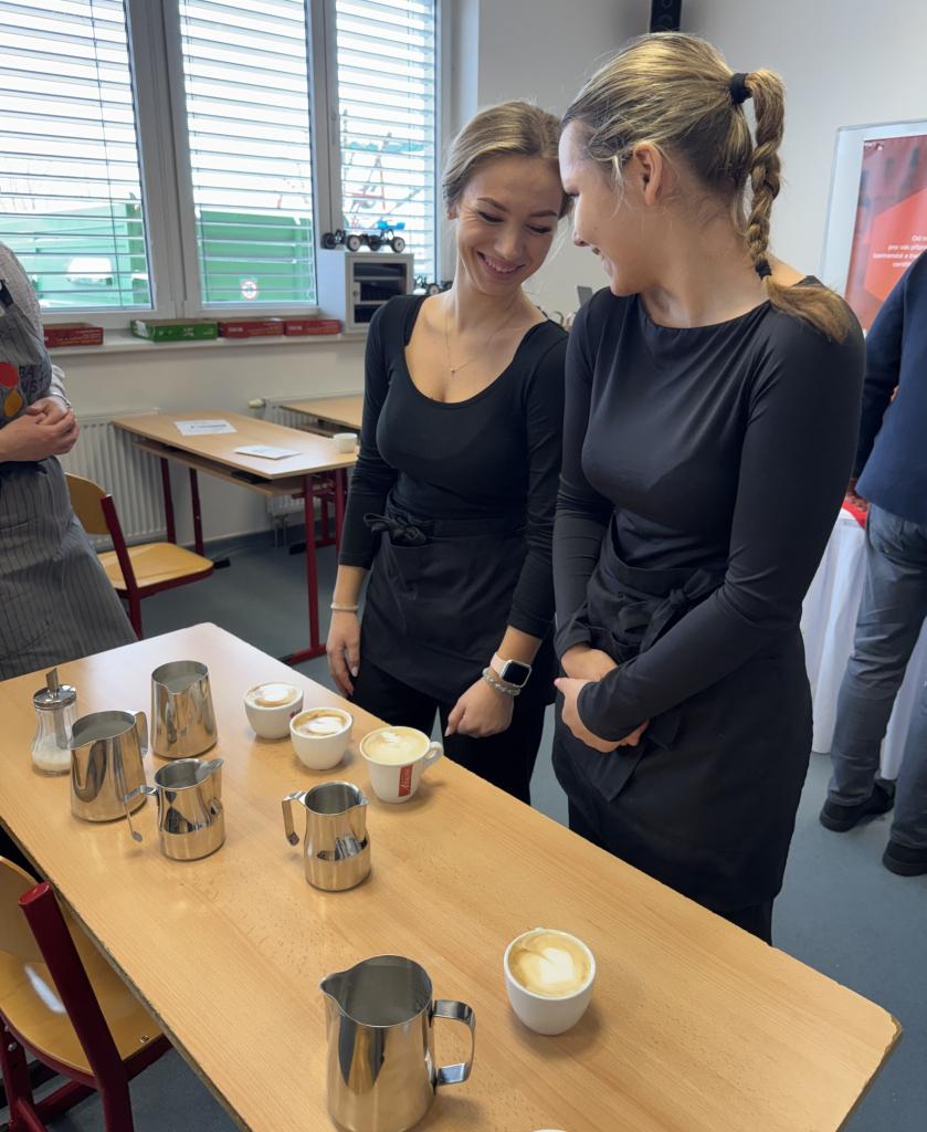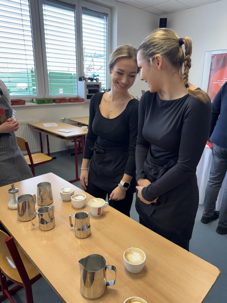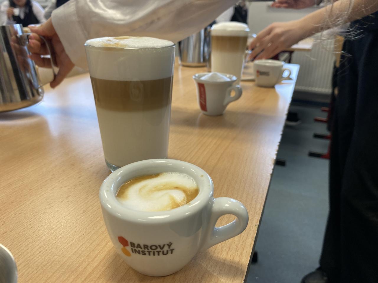 Dnes ale v kavárnách není vše jen o dobře "protlačené" kávě. Jen málokdo si dnes totiž objedná espresso. A tak naši studenti, aby byli na svou budoucí profesi připraveni, musejí vědět, jaké poměry kávy a mléka obsahují různé druhy kávových nápojů. Učili se tedy jak připravit vše od Ristretta až po Flat white.