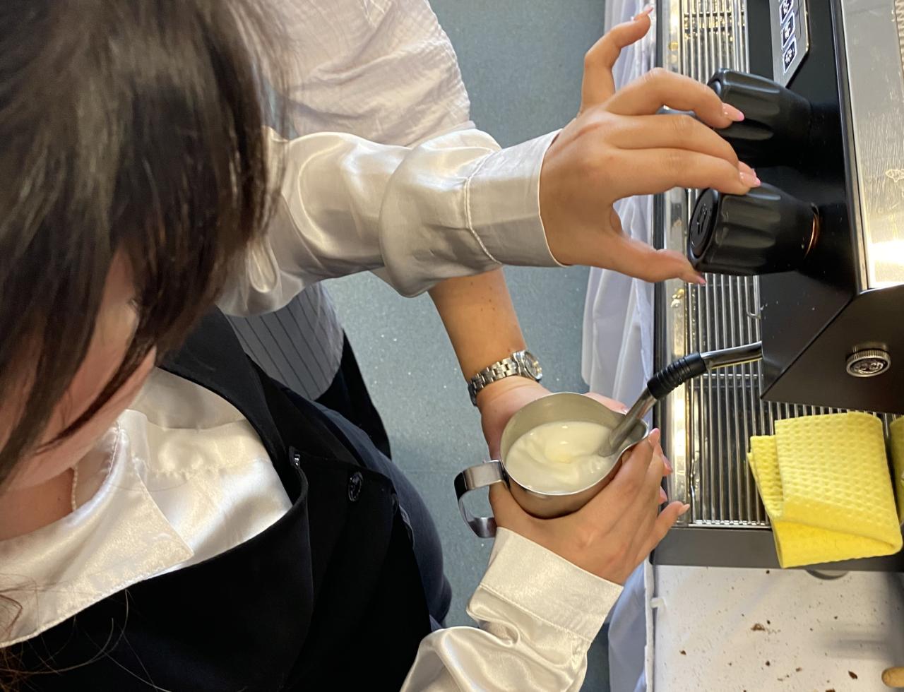 A na to, aby se mohl vytvořit takový nápoj o který si zákazník nespálí jazyk, se kterým se dá pracovat, ale hlavně který dobře chutná, učili se naši žáci i tomu, jak správně pomocí parního kávovaru ušlehat mléko dle těch nejmodernějších kritérií.