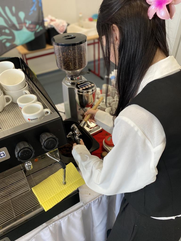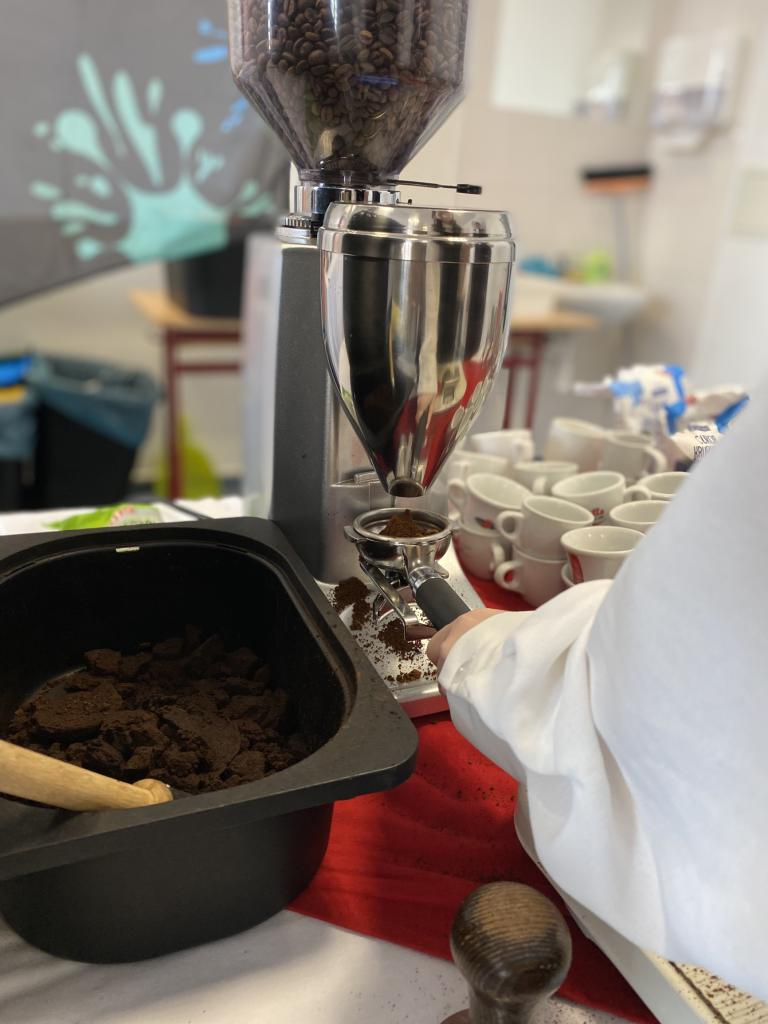 Chlapci a děvčata se učili jak správně naplnit kávovou páku čerstvě namletou kávou. Protože jak kávu umeleme, kolik jí vsypeme, jak ji upravíme, utlačíme a na jak dlouho necháme protékat horkou vodu, ale také jak si kávovar a nářadí vyčistíme, to vše dělá velké rozdíly v tom, jak dobře nám espresso (základní přísada všech typů kávových nápojů) chutná.
