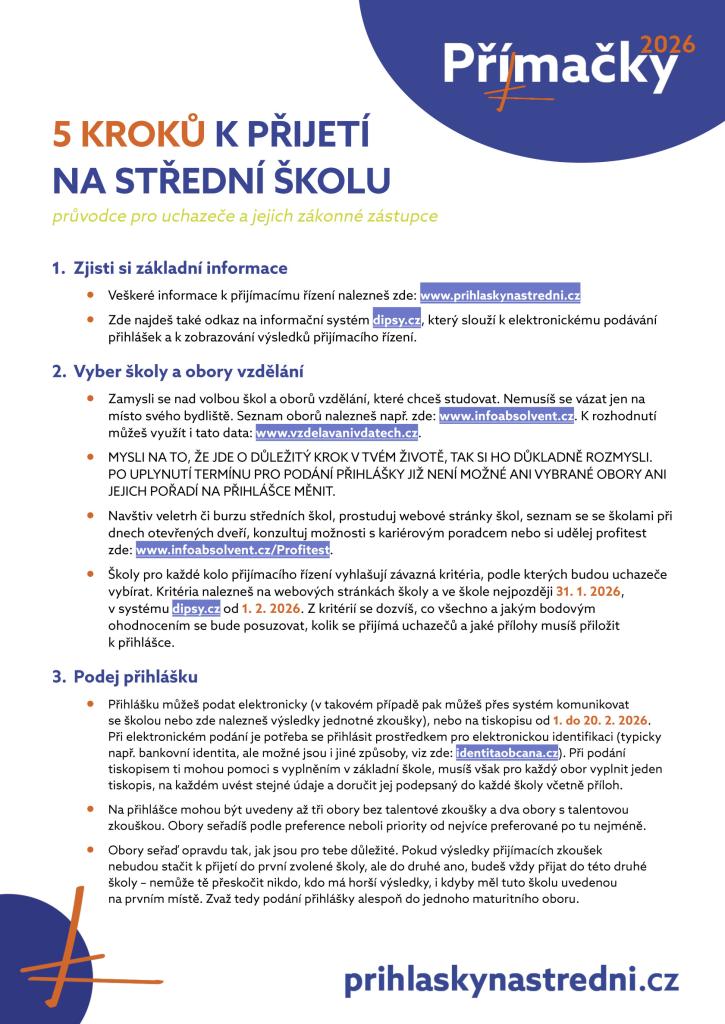 Nebo obecné informace k přijímacímu řízení najdete zde: https://www.prihlaskynastredni.cz/rodice-zaci.php.